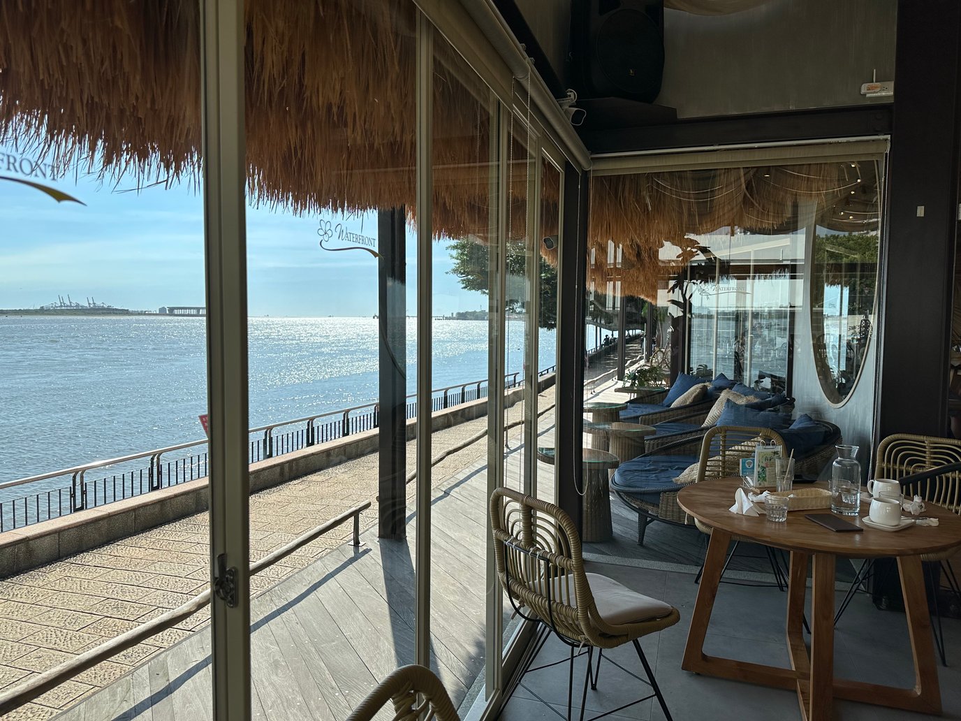 整家店充斥著濃濃南洋風情,從設備、餐點,甚至員工的制服都是。店在位置開得非常好,距離馬偕牧師上岸處走路大約5分鐘的路程,而河岸的位置又剛剛好可以遠眺淡水河出海口,還能望見台北港。落日時分,整個視野所及真的非常優美。